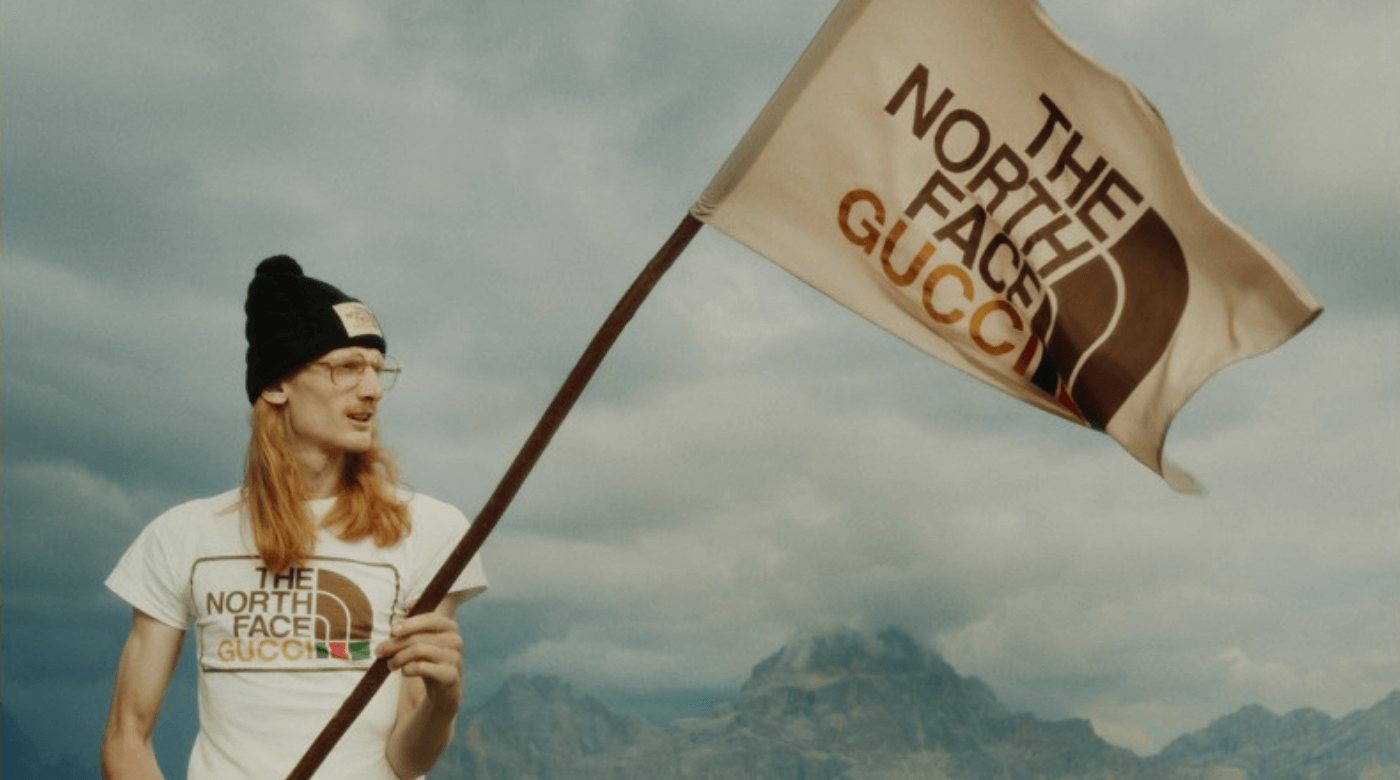Gucci与The North Face挥动印有两个品牌logo的旗帜,一起发表致敬探索精神的The North Face x Gucci联名系列,登山、滑雪、露营等户外运动在欧美国家一直是相当大众的休閒活动,包含对地点和文化的自由冒险。