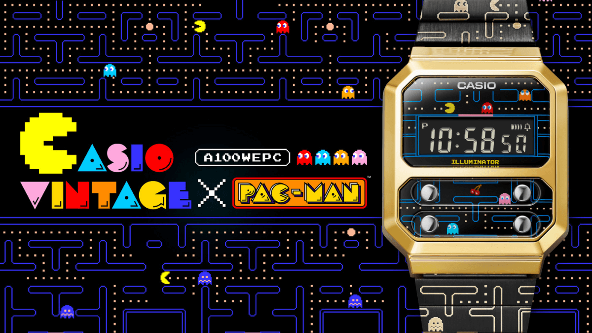Casio与经典游戏Pac-man合作推出A100WEPC电子手表,这是以1978年发布的F-100电子手表升级版,而且把经典吃豆人游戏元素加入手表里。
