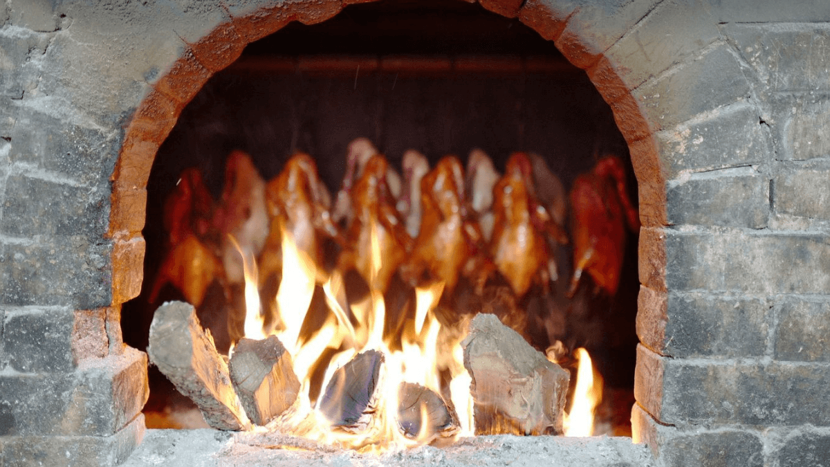 举例来说,京式分为挂炉与焖炉两种烤具,挂炉常见于烤鸭专卖店,一整面的砖砌壁炉,一只横杆挂满鸭子。底下则烧果木,利用明火让鸭子烤熟,以北京全聚德为代表。